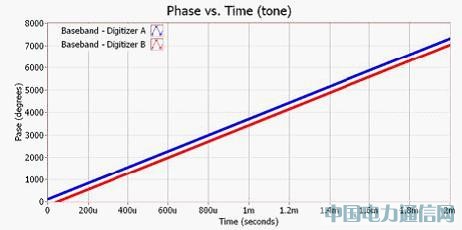 從圖 6 可發(fā)現(xiàn),相位于每個(gè)微秒 (Microsecond) 可提升將近 360 – 亦即所產(chǎn)生的音調(diào)與分析器的中心頻率,可確實(shí)為 1 MHz 偏移。圖 6 中亦可發(fā)現(xiàn),2 組同步取樣示波器之間保持著極小卻穩(wěn)定的相位差 (Phase difference)。此離散相位差是起因于 LO 供電至各組降轉(zhuǎn)換器之間的連接線長(zhǎng)度差異。如接下來(lái)所將看到的,只要針對(duì)其中 1 個(gè) RF 通道調(diào)整 DDC 的開始相位 (Start phase),即可輕松進(jìn)行校準(zhǔn)。