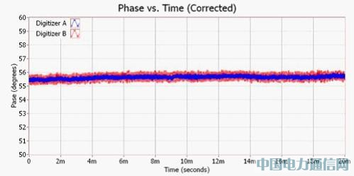 透過分配器 (Splitter) 與對(duì)應(yīng)的連接線長(zhǎng)度,即可量測(cè)各組分析器的「Phase versus time」。假設(shè)訊號(hào)產(chǎn)生器與分析器均集中為相同的 RF 頻率,則可發(fā)現(xiàn)各組分析器的「Phase versus time」圖甚為一致。圖 8 即呈現(xiàn)此狀態(tài)。