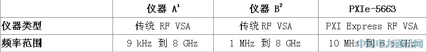 為了展示PXIe-5663 RF矢量信號分析儀的測量速度和精度,我們與一款行業領先的傳統儀器進行了一次巔峰對決(如表1所示)。比對試驗所使用的兩個傳統儀器均為較新的RF矢量信號分析儀(Vector signal analyzers, VSA),并且其價格比一個完整的PXIe-5663 RF測試系統要高出許多。