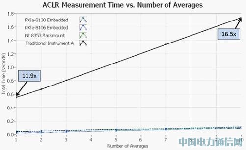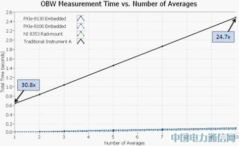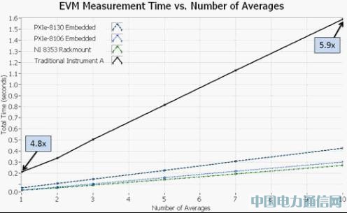 對于處理器密集型的物理層測量來說,選擇不同的處理器對總體的測量時間影響很大。在圖7至9中,可以看到傳統儀器和PXI儀器在測量時間和平均次數之間的關系。