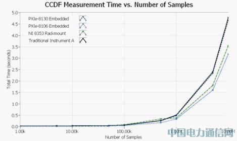 對于多數的WCDMA物理層測量來說,測量值的處理時間對整體的測量時間影響最大。對于這些測量來說,整體的測量時間通常與進行平均的次數有關。但也有一個例外,就是需要特別大的數據采集量的CCDF測量。在這種情況下,處理器的性能對于整體的測量時間影響較小。圖6所示即為CCDF測量,可以看到PXI測量系統比傳統儀器略快一些。