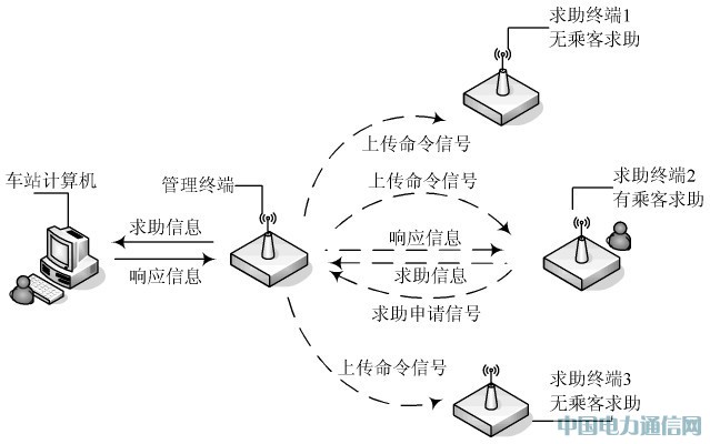 (2)如果第一臺求助終端有乘客求助申請,則求助終端向管理終端發(fā)出求助申請信號。如果第一臺求助終端沒有乘客求助申請,則返回第一步向第二臺求助終端發(fā)送上傳乘客求助信號的命令。