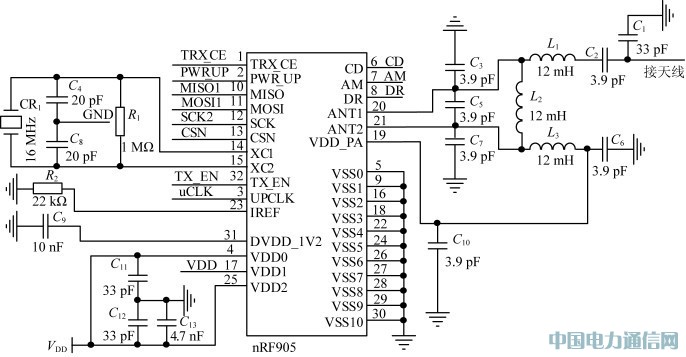nRF905外接電路簡單,不需添加過多外接器件,其外接原理圖如圖3所示。
