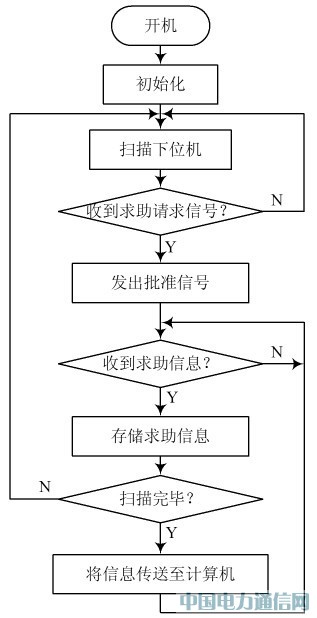 管理終端開機便進行初始化,然后進入掃描求助終端狀態(tài)。當接收到乘客求助請求信號后,便發(fā)出批準信號,收到乘客求助信息后便將乘客求助信息存入寄存器,并繼續(xù)掃描下一臺求助終端,直至一輪掃描完成后,將乘客求助信息傳送至計算機,然后開始下一輪掃描。其工作流程如圖4所示。