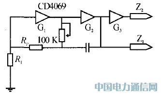 電路中G2輸出的電壓由于 ,的調(diào)節(jié),可以改變輸入到G1輸入端的相位。當相位達到同相時,G1和G2實現(xiàn)正反饋,G1和G2就成了穩(wěn)定的振蕩器。振蕩周期公式為T=2.2×Rf×C.因為CD4069為CMOS結(jié)構(gòu),所以邏輯門前的電阻RP為G1的保護電阻。當RP足夠大時,G1的輸入電流可忽略不計。