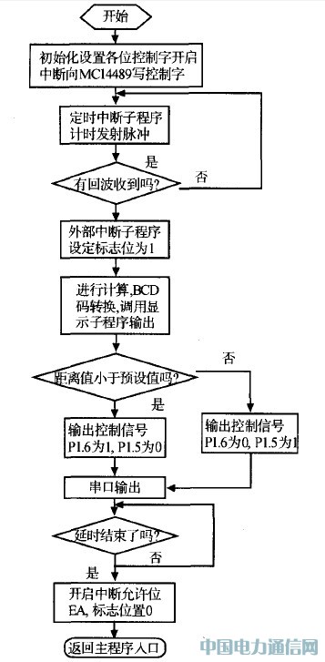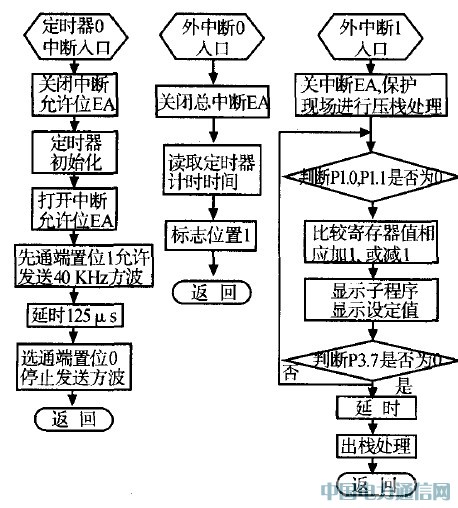 該系統(tǒng)軟件采用8051匯編語言編寫,主程序流程圖如圖8所示。AT89C2051單片機有2個外中斷口,分別用于接收回波中斷和按鍵輸人中斷,對應(yīng)2個外中斷子程序。此外,還用到了內(nèi)部中斷定時器, 它用于控制發(fā)送載波脈沖,如圖9所示。 定時器65 ms產(chǎn)生中斷一次,主要是發(fā)送載波脈沖和計數(shù)器清零。外中斷0將在有下降沿觸發(fā)時產(chǎn)生中斷,用于讀取定時器產(chǎn)生的計時值和使標志位置位。外中斷1是按鍵輸人中斷,用于提供比較值來輸出控制信號。S0第一次觸發(fā)為中斷產(chǎn)生信號,再次觸發(fā)則為輸入確定信號。S1和S2按鍵是輸入值增加和減少按鍵,它們通過判斷對應(yīng)的10口狀態(tài)來確定是否輸入。