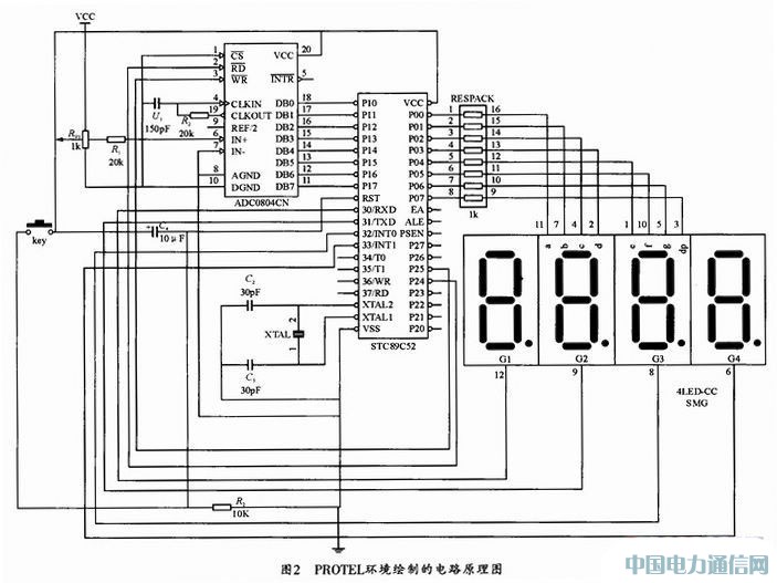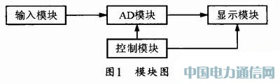 電信號的轉(zhuǎn)換是單通道,在此選擇容易掌握的ADC0804芯片,其模數(shù)轉(zhuǎn)換功能已足夠滿足需求。顯示裝置采用4段8位數(shù)碼管,精確度到個位。其模塊圖如圖1所示。