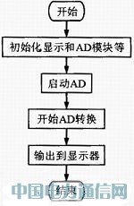 利用Kiel51C語言對各模塊進行編程,程序部分主要由主程序,AD采樣、轉(zhuǎn)換程序,數(shù)碼管顯示程序等組成。軟件程序的流程圖如圖4所示。