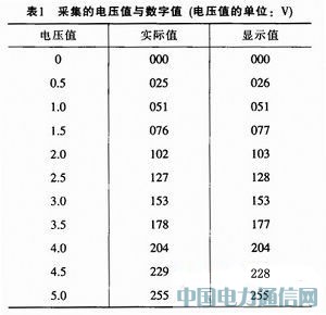 在做好的顯示裝置上采集一系列的電壓值與數(shù)字值。分析電壓值和數(shù)字值之間的對應關系,找出之間的比例關系,并對相關的數(shù)據(jù)結(jié)果整理分析計算出顯示裝置的誤差率。采集的相關數(shù)據(jù)如表1所示: