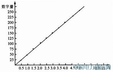 從圖中選取幾組數(shù)字值和電壓值計算出數(shù)字值和電壓值之間滿足線性關系的斜率為50.33,即以Y表示數(shù)字值,X為電壓值,則Y=50.33X.