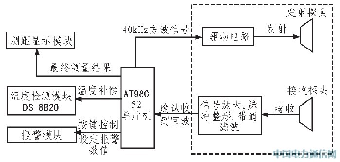 測距技術在物位檢測、醫療探傷、汽車防撞等民用、工業領域應用廣泛,由于超聲波的速度相對于光速要小的多,其傳播時間就比較容易檢測,并且易于定向發射,方向性好,發射強度好控制,且不受電磁干擾影響,因而利用超聲波測距是一種有效的非接觸式測距方法。但超聲波在不同環境溫度下傳播速度不同,如忽略溫度影響,將影響最終測量精度。本文介紹的超聲波測距儀采用渡越時間檢測法,使用了DS1 8B20溫度傳感器對現場溫度進行檢測,并通過軟件計算實現波速的溫度補償,消除了溫度對測量結果的影響,使測量誤差降低。