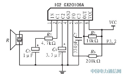 在接收電路中使用了紅外線接收處理芯片CX20106A,因為它處理的是38 kHz的紅外信號,而40 kHz的超聲波信號和它比較接近,并且CX20106A芯片具有很強的抗干擾能力,這個芯片的外圍電路很簡單而且通過外圍電阻調節它的中心處理頻率,通過改變外圍電路電容的大小也可以改變接收電路靈敏度和抗干擾能力。