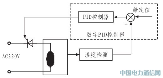 τ為純滯后時間,K為放大倍數,T為慣性時間。在滯后時間和慣性時間均不太大、控制對象非線性小,參數時變性小的場合,RID控制是一種最直接最有效的控制方法。本文采用數字PID控制技術,設計了一個實驗室可用、中小型的、溫度在環境溫度至此320℃范圍內可調的電加熱爐溫度控制系統,系統結構如圖1所示。