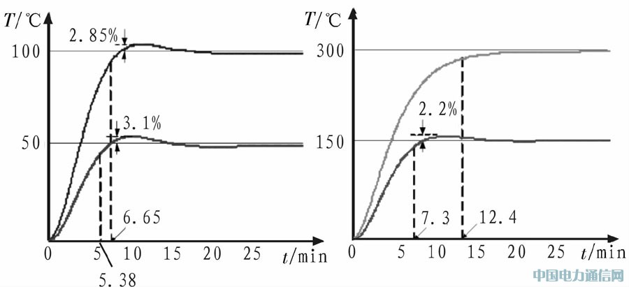 該系統爐溫在一定范圍內根據實際控制對象可以人工設定,圖5為電加熱爐溫度設定值在50、100、150和300℃時的升溫曲線圖。從圖中可以看出,爐溫獲得了良好的控制,各項指都達了電加熱爐加熱對象要求起跳快、調量小、控制平穩的技術指標。