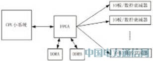 可編程衰減器由CPU板和IO板構(gòu)成。CPU板主要由CPU小系統(tǒng)和FPGA組成,CPU板通過FPGA-Cyclone II集中控制外接的IO板。IO板的功能主要是采用FPGA-LFXP10控制數(shù)控衰減器衰減量,實現(xiàn)對無線信道衰落的模擬,從而實現(xiàn)對測試場景的模擬。