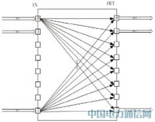 圖3展示了可編程衰減器的8×8結(jié)構(gòu)。本衰減器可對任一路無線信道模擬其它無線信道對其的影響。通過調(diào)節(jié)其它信道與該信道之間的衰減值,就可在實驗室模擬復(fù)雜的外場環(huán)境。