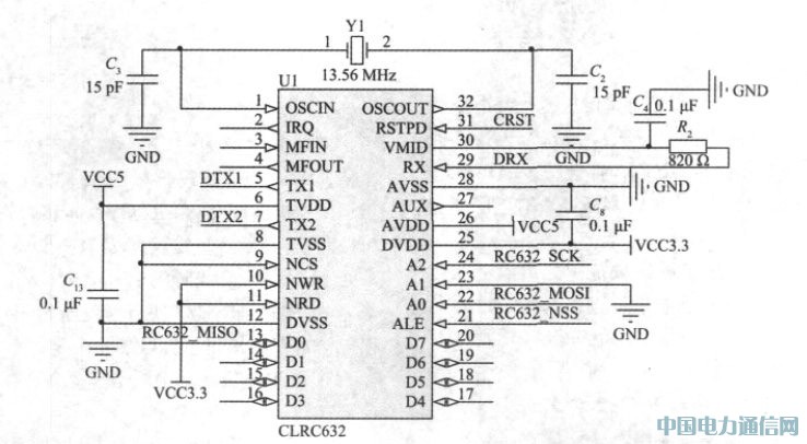 RC632與天線之間通過3個管腳DTX1、DTX2與DRX進行通信,它會把調制好的13.56MHz的能量載波通過管腳DTX1、DTX2傳輸到天線,而天線則通過管腳DRX把13.56MHz的能量載波傳輸回RC632.一般采用2種方法將天線連接到RC632:直接匹配天線和50Ω匹配天線,本系統采用直接匹配的方式將RC632與天線連接,其包括了EMC低通濾波器、天線匹配電路與接收電路。