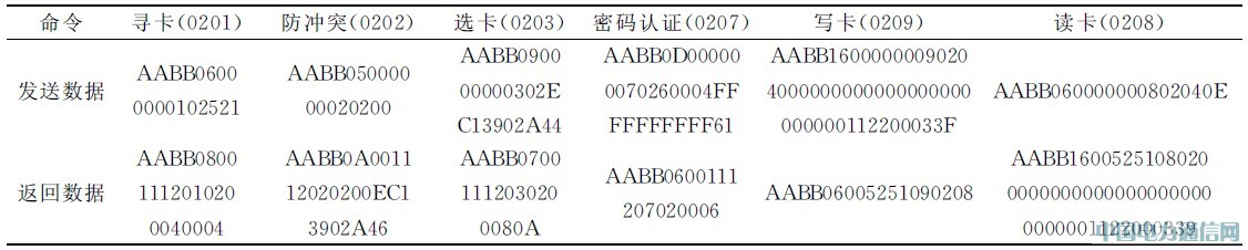 報頭2字節固定為AABB,報文長度代表從節點到校驗的字節之和,命令代碼指明了報文的功能。常用的命令代碼有0201(尋卡)、0202(防沖突)、0203(選卡)、0206(密碼認證)、0208(讀卡)、0209(寫卡)等。