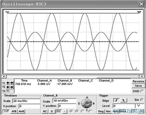 10uV 交流信號經(jīng)過圖2 放大電路放大, 可得到30mV 的電壓交流信號, 如雙通道示波器所示。