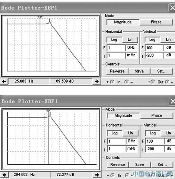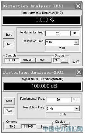 本文設(shè)計的放大電路主要是放大低頻微弱信號, 對高頻也有一定的抑制, 雙擊XBP1 波特圖示儀的圖標, 設(shè)置合理的參數(shù), 顯示出電路的幅頻特性曲線, 如圖5 所示, 在圖中曲線的中間水平線中可以清楚得到電路的增益為69.589dB,用鼠標拖動讀數(shù)軸可得上限頻率fH =294.963Hz, 下限頻率fL=0, 頻帶寬度B= fH - fL =294.963Hz4.6 電路失真度測試雙擊XDA1 的失真度測量儀圖標, 出現(xiàn)如圖6 所示界面, 調(diào)整好參數(shù), 可得到電路的失真度為零, 信噪比是100dB, 所以本電路信噪比高, 噪音小。