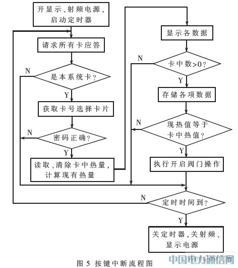 系統工作原理:當需要讀卡操作時,先由按鍵電路把單片機從低功耗模式喚醒,單片機收到有效讀卡信息后打開射頻卡讀寫電路的電源,對進入射頻場的IC卡請求應答,當判斷有本系統的IC卡后進行通信,讀取卡中的熱量值,加到熱量表原有的熱量值中,對所購熱值和現有熱值進行存儲,并把IC卡中的熱量值清零,同時在LCD顯示器中顯示IC卡號、本次購買熱量和熱量表現有熱量等信息。若讀取IC卡之前熱量表中的熱值為0,讀取后現有熱值大于0,則打開閥門控制電路的電源,執行打開供暖管道進水口的操作,當微處理器檢測到閥門有效打開后,關閉閥門控制電路的電源。系統對射頻場掃描一段時間后關閉射頻讀寫模塊的電源。