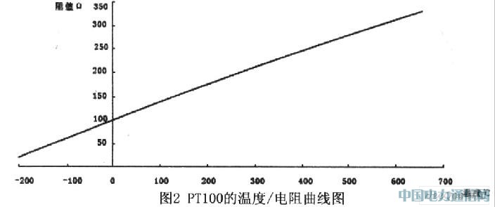 溫度是表征物體冷熱程度的物理量,它可以通過(guò)物體隨溫度變化的某些特性(如電阻、電壓變化等特性)來(lái)間接測(cè)量,金屬鉑(Pt)的電阻值隨溫度變化而變化,并且具有很好的重現(xiàn)性和穩(wěn)定性,利用鉑的此種物理特性制成的傳感器稱為鉑電阻溫度傳感器,通常使用的鉑電阻溫度傳感器零度阻值為100Ω,電阻變化率為0.3851Ω/℃。鉑電阻溫度傳感器精度高,穩(wěn)定性好,應(yīng)用溫度范圍廣,是中低溫區(qū)(-200~650℃)最常用的一種溫度檢測(cè)器,不僅廣泛應(yīng)用于工業(yè)測(cè)溫,而且被制成各種標(biāo)準(zhǔn)溫度計(jì)供計(jì)量和校準(zhǔn)使用。PT100的溫度/電阻曲線如圖2所示。