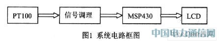 根據(jù)測(cè)試系統(tǒng)所要求的測(cè)量范圍,選用的傳感器為鉑電阻PT100,Pt100的測(cè)量范圍是-200到850,從PT100的分度表可以計(jì)算出線性度為,無(wú)法達(dá)到測(cè)量精度的要求,所以需要一個(gè)線性補(bǔ)償?shù)男盘?hào)調(diào)理電路,線性補(bǔ)償電路通過(guò)采用XTR105芯片,通過(guò)溫度測(cè)量范圍匹配電阻,從而達(dá)到設(shè)計(jì)要求。AD轉(zhuǎn)換用MSP430F149單片機(jī)內(nèi)部12位分辨率的ADC。LCD是2行×16列的字符型液晶顯示器。系統(tǒng)的電路框圖如圖1所示。