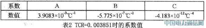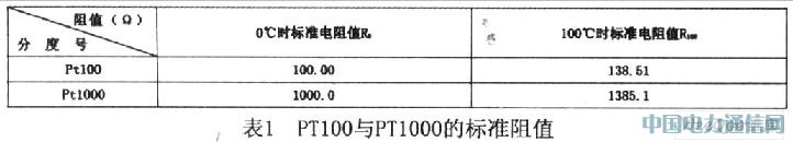 按IEC751國(guó)際標(biāo)準(zhǔn),溫度系數(shù)TCR=O.003851,Pt100(R0=100Ω)、Pt1000(R0=1000Ω)為統(tǒng)一設(shè)計(jì)型鉑電阻。TCR=(R100一R0)/(R0×100)。PT100與PT1000的標(biāo)準(zhǔn)阻值如表1所示。