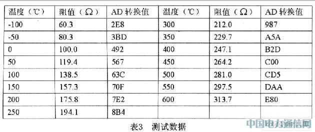 完成硬件與軟件的設(shè)計(jì)后,進(jìn)行系統(tǒng)聯(lián)試。首先測(cè)試ADC的功能模塊,測(cè)試的方法采用高精度的可變電阻器替代鉑電阻PT100的阻值,根據(jù)鉑電阻PT100分度表調(diào)節(jié)對(duì)應(yīng)溫度的可變電阻的阻值,從-100℃到600℃區(qū)間取15個(gè)點(diǎn),每50℃測(cè)試一次,記錄AD轉(zhuǎn)換值。溫度和轉(zhuǎn)換值進(jìn)行最小二乘法線性擬合,計(jì)算出線性度等測(cè)量系統(tǒng)的指標(biāo)。線性度計(jì)算結(jié)果為小于1%,測(cè)量數(shù)據(jù)如下: