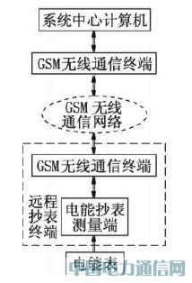 無(wú)線抄表系統(tǒng)是由監(jiān)控中心計(jì)算機(jī)系統(tǒng)、無(wú)線遠(yuǎn)程抄表終端和GSM無(wú)線通信移動(dòng)網(wǎng)三部分構(gòu)成,系統(tǒng)總體結(jié)構(gòu)如圖1所示。監(jiān)控系統(tǒng)中心計(jì)算機(jī)的主要功能是接收下位機(jī)發(fā)來(lái)的電度數(shù),算出電費(fèi),然后發(fā)送短消息到用戶手機(jī),并生成和打印報(bào)表等。遠(yuǎn)程抄表終端定時(shí)讀取電度表,并發(fā)送到監(jiān)控中心計(jì)算機(jī)。