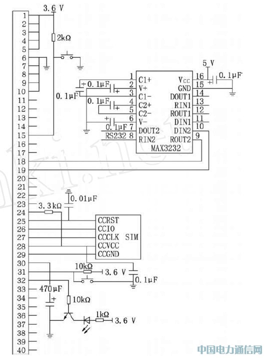 TC35 i有40個(gè)引腳,通過(guò)一個(gè)ZIF (零阻力插座)連接器引出。這40個(gè)引腳可以劃分為5類,分別為電源、數(shù)據(jù)輸入/輸出、SIM卡、音頻接口和控制。其中15腳為點(diǎn)火線IGT,當(dāng)TC35 i通電后需給IGT一個(gè)大于100ms的低電平,模塊才啟動(dòng); 31 為Power down, 32 為SYNC.16 - 23 為數(shù)據(jù)輸入/輸出,分別為DSR0、RING0、RxD0、TxD0、CTS0、RTS0、DTR0和DCD0.TC35 i的數(shù)據(jù)輸入/輸出接口實(shí)際上是一個(gè)串行異步收發(fā)器,符合ITU - TRS232接口標(biāo)準(zhǔn)。它有固定的參數(shù): 8位數(shù)據(jù)位和1位停止位,無(wú)校驗(yàn)位,波特率在300 bp s~115 kbp s之間可選,硬件握手信號(hào)用RTS0 /CTS0,軟件流量控制用XON /XOFF, CMOS電平。