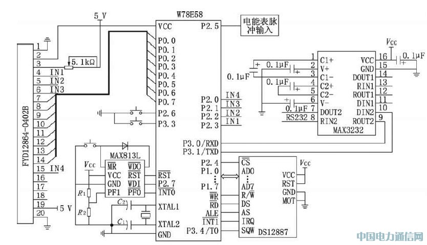 液晶顯示模塊采用帶中文字庫(kù)的128X64是一種具有4位/8位并行、2線或3線串行多種接口方式的FYD12864 - 0402B,內(nèi)部含有國(guó)標(biāo)一級(jí)、二級(jí)簡(jiǎn)體中文字庫(kù)的點(diǎn)陣圖形液晶顯示模塊;內(nèi)置8192個(gè)16 3 16點(diǎn)漢字,和128個(gè)163 8點(diǎn)ASC II字符集,也可完成圖形顯示。系統(tǒng)還可以通過(guò)按鈕實(shí)現(xiàn)查詢當(dāng)前用電量、本月用電量等功能。