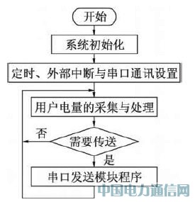 程序設(shè)計(jì)的任務(wù)是: (1)用戶電量的采集與處理;(2) TC35 I的啟動(dòng)、狀態(tài)檢測(cè); (3)單片機(jī)與TC5 i的串口通信; (4)液晶顯示。系統(tǒng)軟件主要由初始化模塊、電量的采集模塊程序、串口發(fā)送模塊程序和顯示模塊四部分組成。主程序流程如圖4所示。