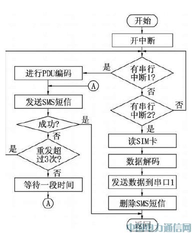 目前,發(fā)送短消息常用Text和PDU ( Protocol DataUnit,協(xié)議數(shù)據(jù)單元)模式。使用Text模式收發(fā)短信息代碼簡(jiǎn)單,實(shí)現(xiàn)起來(lái)容易,但缺點(diǎn)是不能收發(fā)中文短信:而PDU模式不僅支持中文短信,也能發(fā)送英文短信。PDU模式收發(fā)短信可使用3種編碼: 7 - bit、8 -bit和UCS2編碼。7 - bit編碼用于發(fā)送普通的ASC II字符,8 - bit編碼通常用于發(fā)送數(shù)據(jù)消息,UCS2編碼用于發(fā)送Unicode編碼字符。單片機(jī)與TC35 i的軟件接口其實(shí)就是單片機(jī)通過(guò)AT指令控制手機(jī)的控制技術(shù),首先設(shè)置TC35 i模塊的工作模式; AT + CMGF =n, n = 0 為PDU 模式,n = 1為文本模式;通常設(shè)置為PDU模式,在這種模式下,能傳送或接受透明數(shù)據(jù)(用戶自定義數(shù)據(jù)) .AT +CMGL = n為讀TC35 i模塊內(nèi)的短消息,n為短消息信號(hào)。AT + CMGL = n為列出模塊內(nèi)的短消息,n = 0時(shí)未讀的短消息,n = 1為已讀的短消息,n = 2為未發(fā)送的短消息,n = 3為已發(fā)送的短消息,n = 4為所有短消息。AT +CMGL = n為刪除TC35 i模塊內(nèi)的短消息,n為短消息編號(hào)。通過(guò)TC35 i寫入不同的AT指令,能完成多種功能,如網(wǎng)絡(luò)登錄、發(fā)送SMS消息、接受SMS消息等。在本系統(tǒng)中串口通信采用中斷的方式來(lái)實(shí)現(xiàn)的,其短消息發(fā)送流程圖如圖5所示。