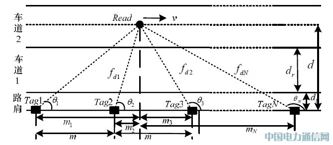 某一時刻,接收到來自射頻卡1,2,…,N 的信號。圖中v 表示車輛行駛速度, 1 2 , , , N θ θ ??θ 為車輛相對射頻卡1,2,…,N 的徑向方向與車輛行駛方向的夾角,m 為兩射頻卡間的距離,m1,m2,…,mN 為射頻卡1,2,…,N 同車輛行駛方向法線間的距離,d 為車輛到射頻卡垂直距離,dr 為車道寬度,dl 為路肩寬度, 1 2 d , d , , dN f f ?? f 為車輛相對射頻卡1,2,…,N 的多普勒頻移。