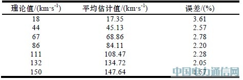 分別設定v 為30 km/h、60 km/h、90 km/h、120 km/h、150 km/h,針對不同位置對車輛速度進行反復測量,其平均誤差如表2 所示。當車輛接近靜止時,由于不存在多普勒頻移或多普勒頻移十分微小,由系統設定v=0.隨著車輛移動速度的提高,由于多普勒頻移在夾角一定的情況下同速度呈正比,因此速度誤差會隨著fd 測量誤差的減小略呈下降趨勢。