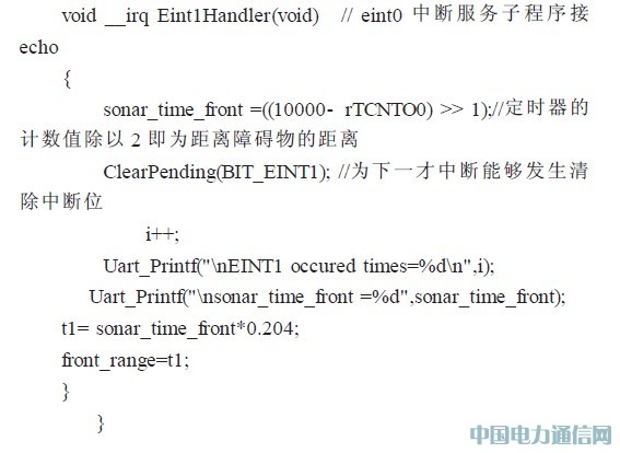 超聲波的回波的檢測是個難點,因為在ARM中一個端口設置中斷只能設置一種觸發方式,如果設為上升沿觸發可以打開定時器定時但無法捕獲下降沿,也就無法關閉定時器,從而不能測距,因此用軟件的方式實現。首先設置兩個時間延遲函數usdelay()和msdelay(),這樣可以在給出高脈沖10us 后等超聲波觸發再打開定時期計時,在設置一個外部中斷eint1 接到超聲波傳感器的echo 口并設置為下降沿觸發,等下降沿來臨關閉定時器讀出值既為脈寬的時間長度,然后根據障礙物的距離=(ECHO高電平的時間)* 聲納速度/2 得出距離。空氣中v 與溫度關系:v=331.5√1+T/273 m/s,T 為攝氏溫度。一般情況下超聲波速近似聲速,在室內溫度影響下取約343.2m/s.