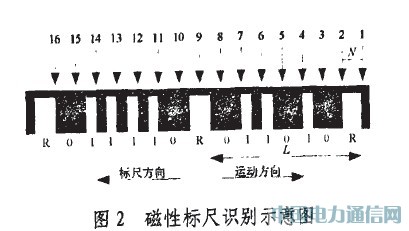 根據磁敏傳感原理,“凹槽”和“凸槽"會導致不同的磁場強度,從而使磁敏元件相應地輸出不同的電半信號“0”或“1”,形成數值碼,用于確定位移的粗讀值;而標志位R碼寬兩倍于碼元“1”寬度的特點,使得識別后的序列出現具有固定特征的標識碼,它用于精讀數。