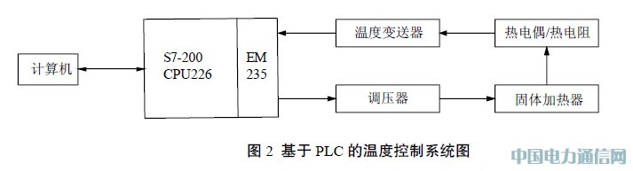 信號處理、溫度調節等功能。在,溫一個溫度控制系統一般具有溫度信號采集、PLC的溫度控制系統中度信號的采集可以使用常用的溫度傳感器(熱電偶、熱電阻)。由溫度傳感器檢測來的信號不是標準的電壓(電流)信號,不能直接送給A/D轉換模塊。因此溫度傳感器采集到的溫度信號要經過變送器的處理后才能被A/D轉換器識別并轉換為相應的數字信號。根據所使用的溫度傳感器選用對應的溫度變送器。S7-200系列PLC常用的模擬量輸入輸出混合模塊為EM235,EM235為4路模擬量輸入,1路模擬量輸出。PLC對溫度信號進行處理后,通過模擬量模塊輸出電流信號,電流信號可以通過調壓器來控制電源的開度(即一周期內的導通比率),從而控制電源的輸出功率。加熱器根據電源輸出功率調節加熱強度,從而達到溫度調節的效果。其系統如圖2所示。