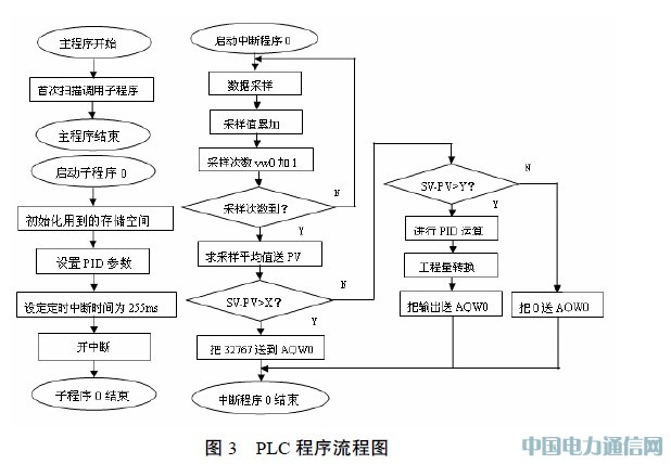 由于電加熱爐具有較大的延時性,所以采輸出值,0.0~1.012 Kc數正數雙字,實數I 回路增益,正、負常數16 Ts I 采樣時間,單位為s,正20 Ti I 積分時間常數,單位為min,24 Td I 微分時間常數,單位為min,正數式控制。大致采用三段控制: 第一段,開始階段置電源為滿開度,以最大的功率輸出克服熱慣性; 第二段,等到溫度達到一定值轉為PID控制; 第三段,接近設定點時置電源開度為0,提供一個保溫階段,以適應溫度的滯后溫升。程序流程圖如圖3 所示,圖中X,Y根據實際設定。