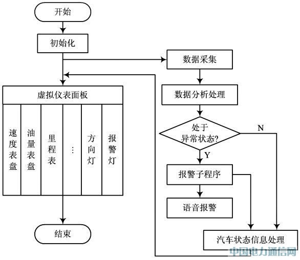 后臺(tái)處理程序主要將系統(tǒng)下層采集的數(shù)據(jù)進(jìn)行分析處理,將有用的數(shù)據(jù)傳送至虛擬儀表面板顯示,實(shí)現(xiàn)虛擬儀表的動(dòng)態(tài)顯示,同時(shí)以多線程的方式不斷檢測(cè)汽車各項(xiàng)狀態(tài),當(dāng)某項(xiàng)狀態(tài)出現(xiàn)異;虼嬖谖kU(xiǎn)時(shí)驅(qū)動(dòng)LCD和語(yǔ)音芯片向駕駛員報(bào)警,其中異常狀態(tài)有超速、存油量過(guò)低、電池電量過(guò)低等。下面以報(bào)警子程序?yàn)槔v解后臺(tái)處理子程序。