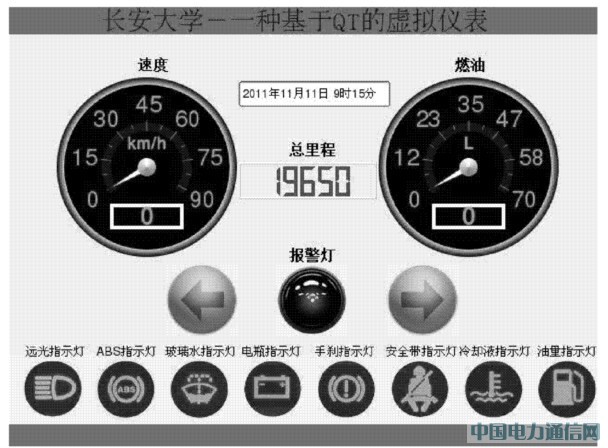 本文所介紹的車載虛擬儀表的基本設(shè)計(jì)思想是將汽車上安裝的各種傳感器采集到的數(shù)據(jù)進(jìn)行智能化的處理,然后在運(yùn)行于嵌入式Linux系統(tǒng)的使用QT設(shè)計(jì)的虛擬儀表盤(pán)上進(jìn)行顯示,以便于監(jiān)測(cè)汽車各系統(tǒng)的工作狀況,如剩余油量、當(dāng)前車速、行駛里程等,并在某狀態(tài)出現(xiàn)異常或存在危險(xiǎn)時(shí)向駕駛員提示報(bào)警。
