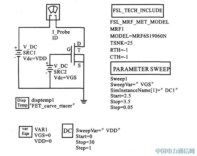 靜態工作點仿真主要是選擇放大器的工作狀態,確定靜態工作點。根據仿真步驟首先在ADS 中導入飛思卡爾的LDMOS 模型庫,并調出MRF6S19060N 模型。建立如圖1 所示的直流仿真電路圖。