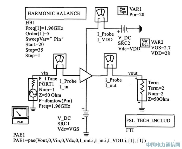 單音信號仿真是掃描功率的諧波平衡仿真,主要是得到ldB 壓縮點和放大器的功率附加效率曲線。圖5 是單音信號仿真電路圖,這里頻率設定為中心頻率1960MHz.