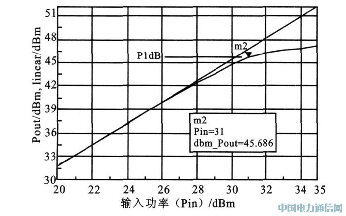 同時還仿真了理想輸出功率和增益壓縮輸出功率與輸入功率的關系曲線。