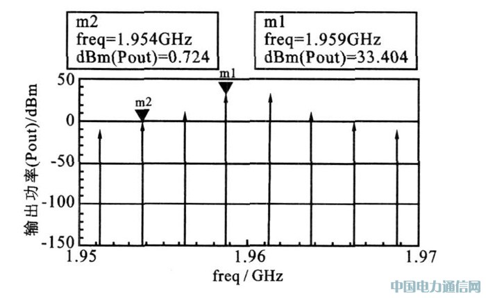 雙音信號仿真是測試放大器線性度的重要手段,它是將頻率相近的射頻信號輸入到放大器,利用諧波平衡法,得出放大器輸出信號中的三階互調失真分量與基波信號的相對關系。將輸入的雙音信號頻率分別設置為1958. 75MHz. 和1961. 25MHz的正弦信號,則三階互調失真的頻率分別為1953.75MHz 和1966. 25MHz. 圖8 為雙音信號的仿真結果。由仿真結果可以計算出IMD3 為- 32. 68dBc.
