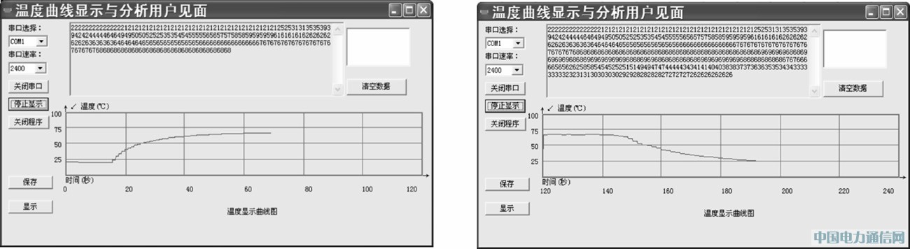 溫度顯示曲線圖的主要任務是將單片機接收到的數據顯示出來,當溫度傳過時,在軟件中分別顯示當前的溫度值和時刻。通過MFC中的Time函數記錄每一個溫度值的時刻。并采用繪圖函數將溫度值和溫度的當前時刻繪成曲線,然后再對數據特殊處理繪制成曲線圖。在這里比較難處理的是實時的溫度采集繪制曲線。
