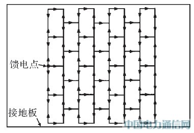 柵格陣列是由柵格單元組成的陣列天線。如圖1所示,采用金屬導(dǎo)體作為矩形柵格單元,每個(gè)矩形單元長(zhǎng)為λ0/2,寬為λ0/4.該陣列平行置于接地板上,接地板到到柵格陣列的距離約為λ0/4.整個(gè)陣列的饋電很簡(jiǎn)單,用50 Ω同軸電纜的內(nèi)導(dǎo)體穿過(guò)接地板上的孔接于柵格陣列,外導(dǎo)體則焊接在接地板上。圖中箭頭表示瞬時(shí)電流分布,柵格單元的所有短邊上電流相位都保持一致,為主要輻射單元。25個(gè)主輻射單元可以實(shí)現(xiàn)增益18.1dBi.