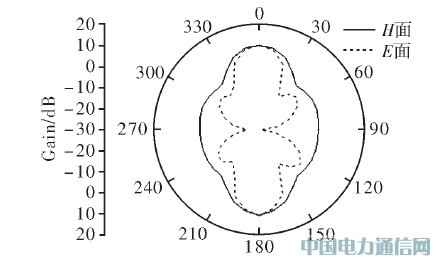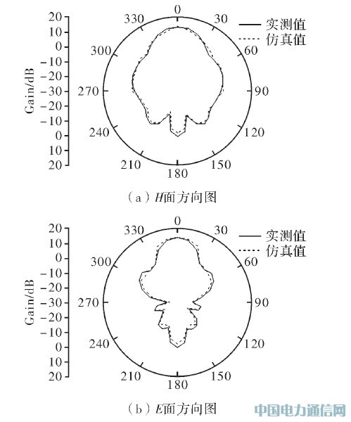 天線中心頻率為1 600 MHz,圖4是f=1 600 MHz天線的輻射方向圖,圖中實(shí)線代表實(shí)測(cè)值,虛線代表仿真值。可以清楚地看到,實(shí)測(cè)方向圖與仿真方向圖吻合良好,且方向圖對(duì)稱性較好。天線3 dB波瓣寬度為35°,通過(guò)微波暗室實(shí)測(cè),天線最大增益可達(dá)13.3 dBi.為體現(xiàn)增益的提升,給出了f=1 600 MHz未加反射器時(shí)的天線方向圖仿真值,如圖5所示,圖中實(shí)線代表H面方向圖,虛線代表E面方向圖。從仿真值可以看出,天線在為未加反射器時(shí)的增益為10.6 dBi,充分說(shuō)明加反射器后,天線增益得到了顯著提升。