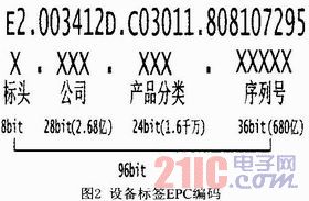 電子標簽:共有三個存儲塊:EPC(電子產品編碼)、TID(標簽標識)、用戶區。EPC采用十六進制842l編碼,共96位(如圖2),為世界每個對象提供一個唯一的編碼。用戶區是為用戶預留的一段空間,用戶可根據實際情況自行寫入信息。